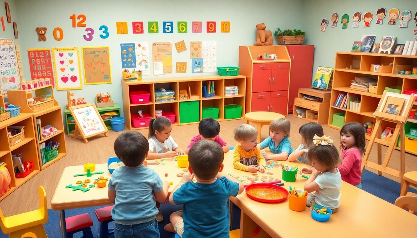 - Literacy corners stocked with picture books, alphabet cards, and writing materials